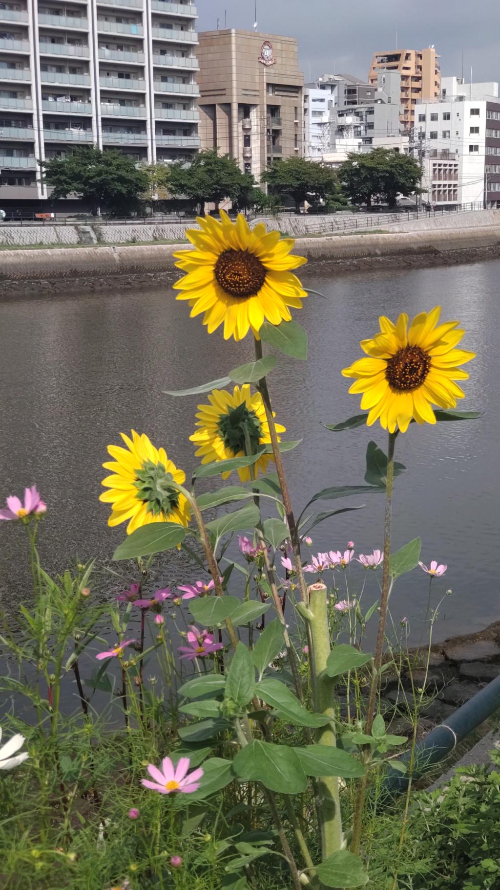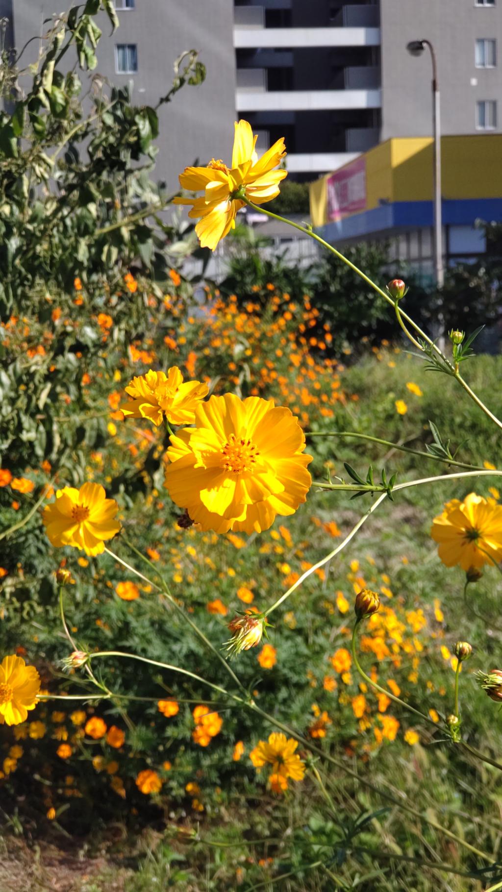 毎年恒例の(1)気象館通りを見た後で、(2)元安川東岸。気象館通りより、密度が濃く一列に。その後で(3)吉島公園のグラウンドネット際に並んで咲くのが元安川より大規模。そして今日見た(4)舟入EDION横の畑、一面のキバナコスモスでした。