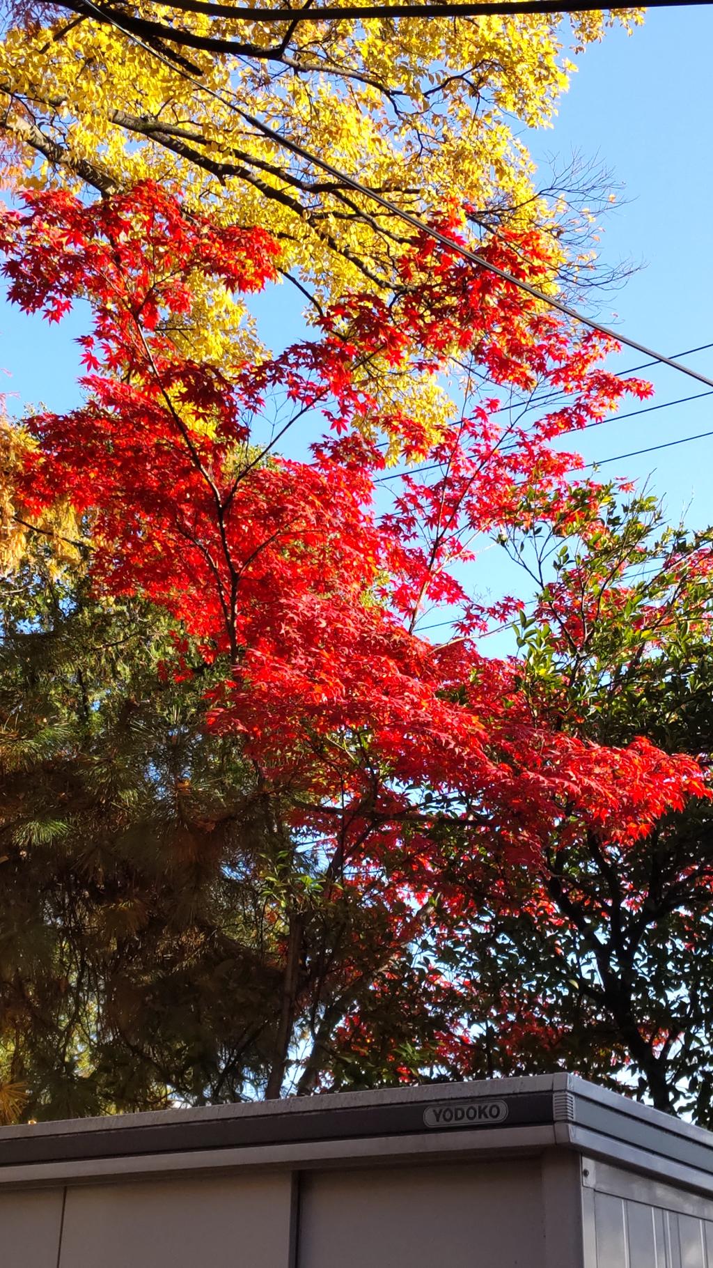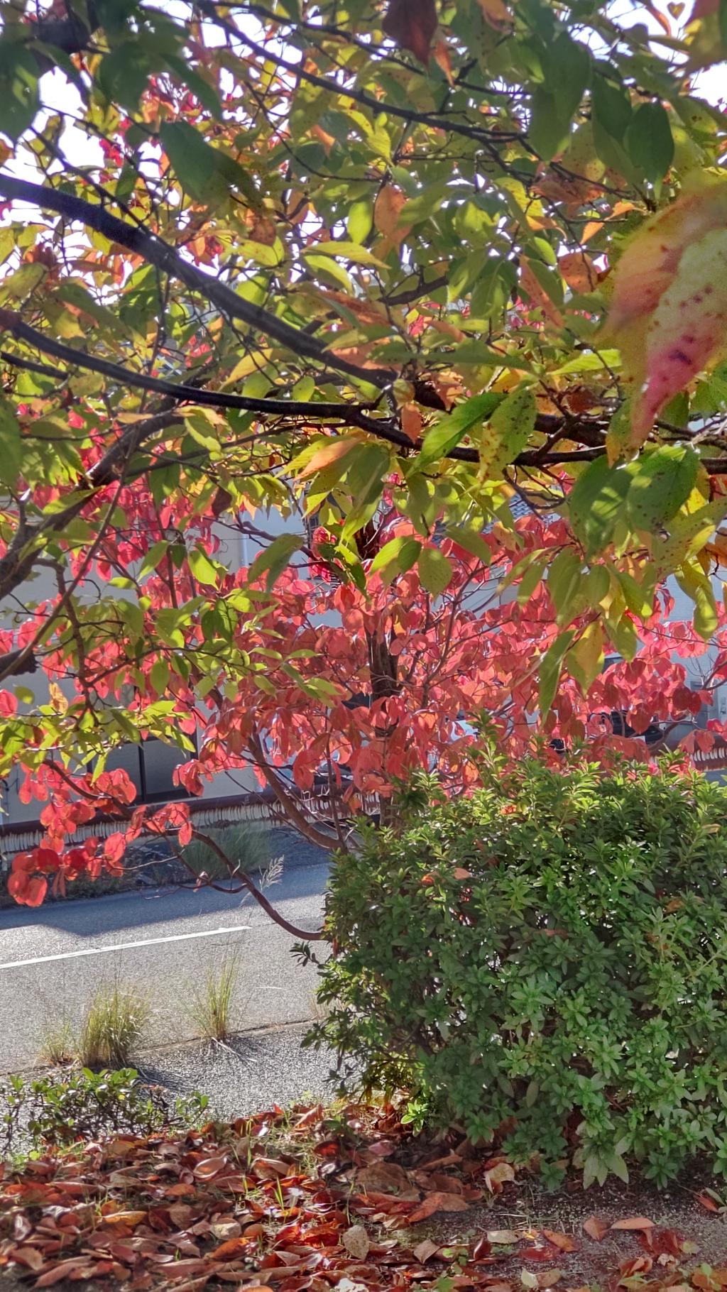 紅葉をあちこちアップしていて、ひんしゅく買うのでもう撮るのを辞めようと思っていました。ウォーキング中に一服しようと空鞘公園に入り、ベンチに向かう時に、鮮やかな赤を見つけました。